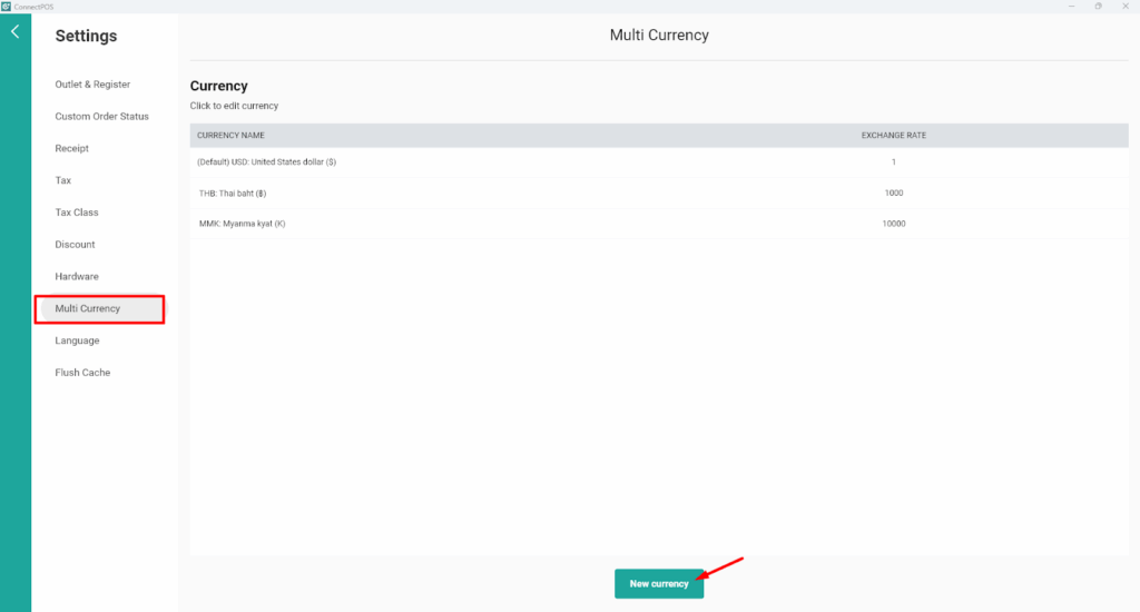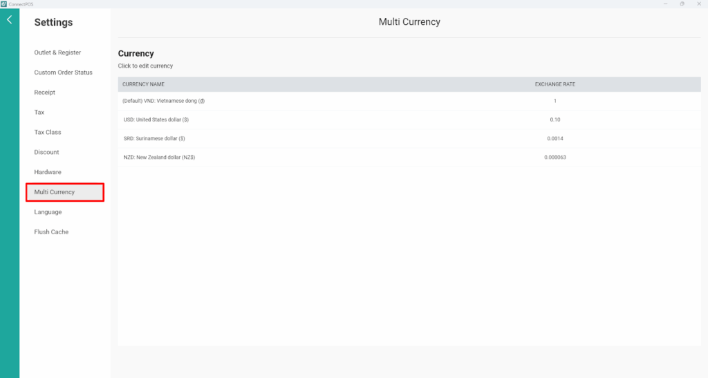 ConnectPOS supports multiple currencies. You can add multi-currencies in Outlet Settings.