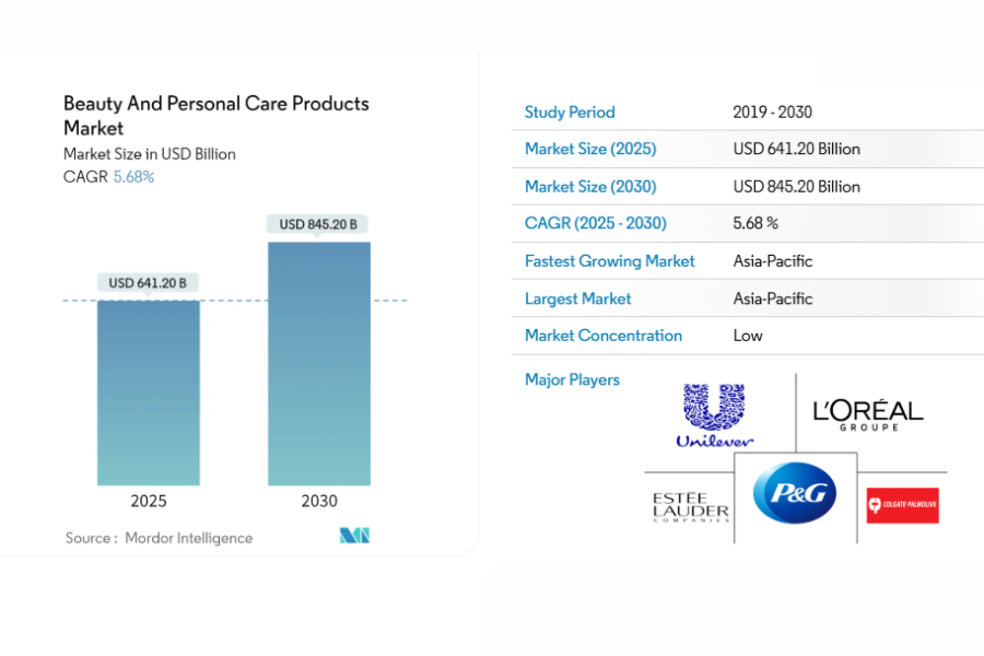 The Beauty and Personal Care Products market is projected to reach USD 641.20 billion in 2025 and grow to USD 845.20 billion by 2030, reflecting a compound annual growth rate (CAGR) of 5.68% over the forecast period (2025–2030).
