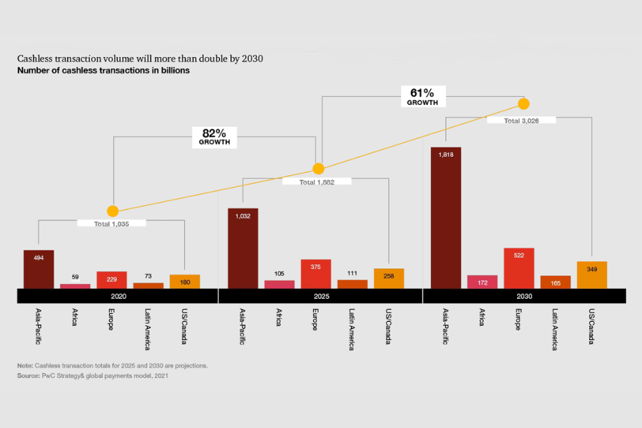 Global cashless payments are projected to rise by over 80% between 2020 and 2025, with Asia-Pacific leading at 109% growth. Africa, Europe, and North America will follow, with varying adoption rates reflecting regional preferences for digital payments.