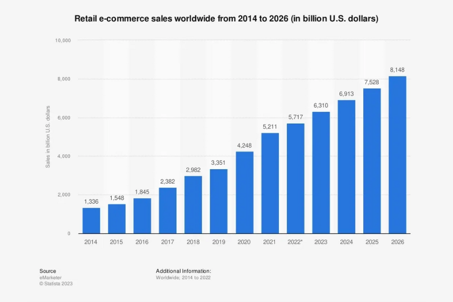 In 2021, global retail eCommerce sales reached approximately USD 4.9 trillion. Projections indicate a significant surge over the next four years, with an estimated 56% growth, surpassing $8.1 trillion by 2026. The trend suggests continued momentum in online shopping with no signs of deceleration.