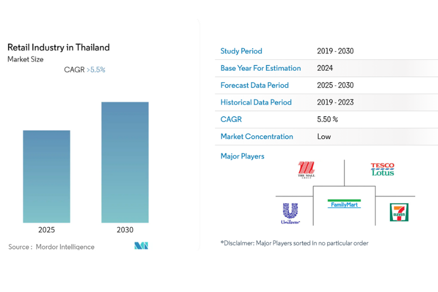 The retail industry in Thailand is projected to grow at a CAGR of over 5.5% during the forecast period. As one of Southeast Asia’s most influential economies, Thailand, particularly its capital, Bangkok, has a thriving retail sector. The city attracts both local and multinational retailers, with the market evolving rapidly to meet consumer demands influenced by the internet.